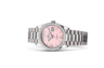 Esta esfera presenta índices en oro de 18 quilates engastados de 32 diamantes y números romanos VI y IX en oro de 18 quilates engastados de 24 diamantes. Rolex ha desarrollado un particular savoir‑faire en la creación de esferas de piedra ornamental, como el ópalo rosa. Los discos de piedra destinados a las esferas se tallan en un bloque de material en bruto. Solo se seleccionan aquellos cuya(s) tonalidad(es) y estructura cumplan plenamente con los estrictos criterios estéticos de la marca. Los elegidos adornarán la esfera de un reloj Rolex confiriéndole una personalidad única.