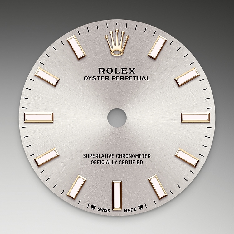 El acabado tipo sol crea delicados reflejos de luz en muchas esferas de la colección Oyster Perpetual. Se obtiene utilizando técnicas magistrales de cepillado que crean surcos que salen del centro de la esfera. La luz se difunde constantemente a lo largo de cada grabado, creando un sutil brillo característico que se mueve según la posición de la muñeca. Una vez completado el acabado tipo sol, el color de la esfera se aplica mediante PVD ( Physical Vapour Deposition ) o galvanoplastia. Una ligera capa de barniz le da a la esfera su aspecto final.