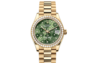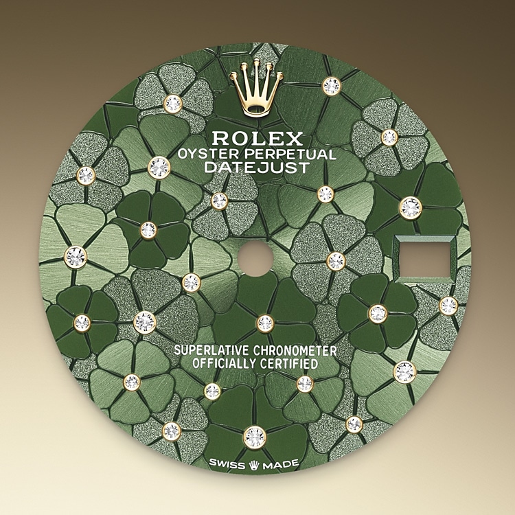Las esferas con motivo floral combinan tres acabados diferentes: tipo sol, mate y granulado Expresión del savoir‑faire de Rolex en materia de esferas, la realización de este refinado motivo decorativo requiere unos procedimientos de acabado de alta tecnología. Estos efectos de textura son realzados por el engaste de 24 diamantes de diámetros variados que iluminan el centro de cada flor.