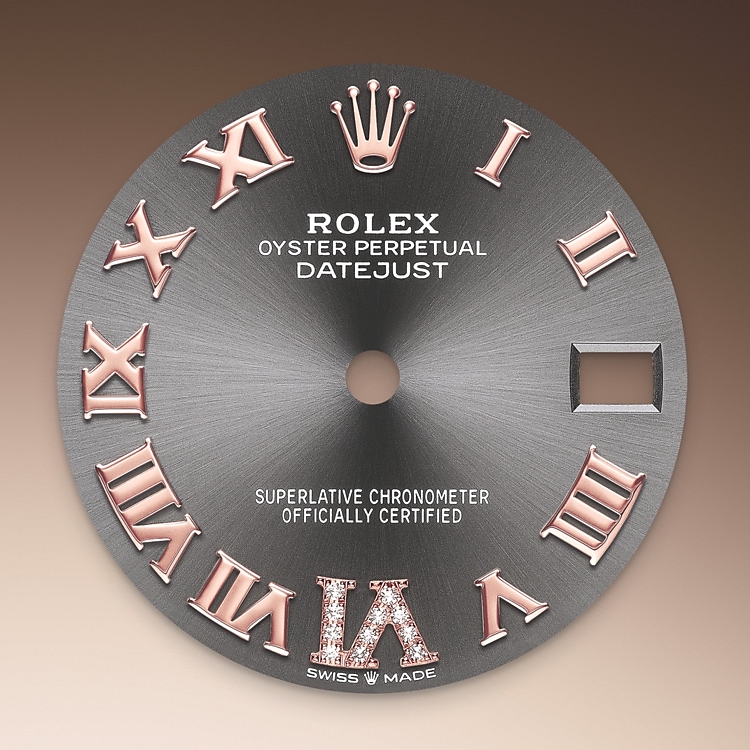 Esta esfera presenta un gran VI engastado de 11 diamantes. El acabado tipo sol crea delicados reflejos de luz en muchas esferas de la colección Oyster Perpetual. Se obtiene utilizando técnicas magistrales de cepillado que crean surcos que salen del centro de la esfera. La luz se difunde constantemente a lo largo de cada grabado, creando un sutil brillo característico que se mueve según la posición de la muñeca. Una vez completado el acabado tipo sol, el color de la esfera se aplica mediante PVD ( Physical Vapour Deposition ) o galvanoplastia. Una ligera capa de barniz le da a la esfera su aspecto final.