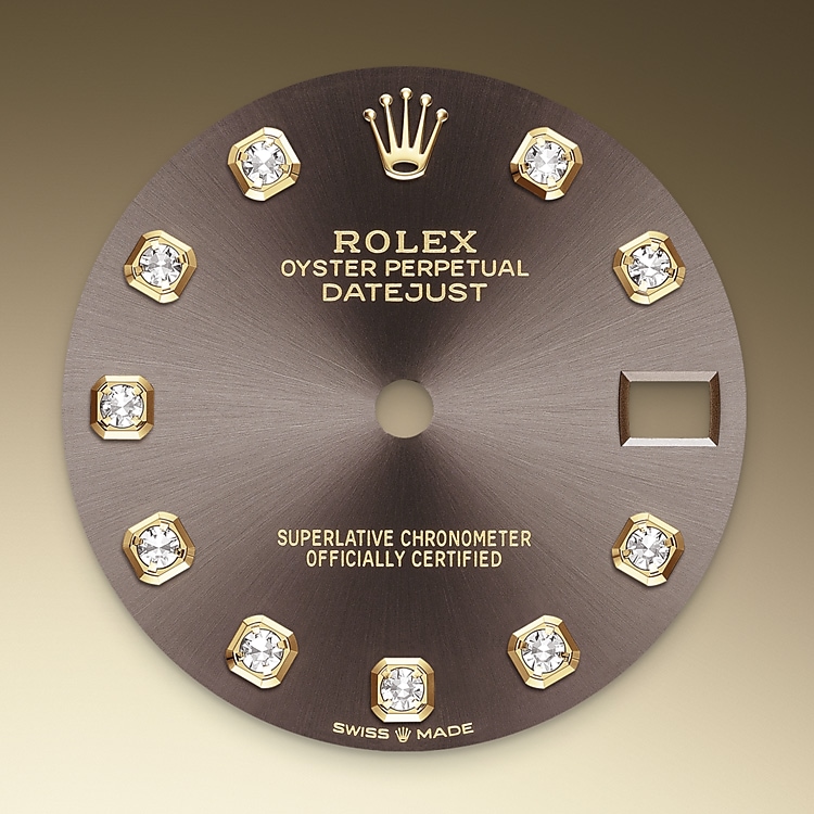 Esta esfera presenta diamantes con engaste chatón de oro de 18 quilates. El acabado tipo sol crea delicados reflejos de luz en muchas esferas de la colección Oyster Perpetual. Se obtiene utilizando técnicas magistrales de cepillado que crean surcos que salen del centro de la esfera. La luz se difunde constantemente a lo largo de cada grabado, creando un sutil brillo característico que se mueve según la posición de la muñeca. Una vez completado el acabado tipo sol, el color de la esfera se aplica mediante PVD ( Physical Vapour Deposition ) o galvanoplastia. Una ligera capa de barniz le da a la esfera su aspecto final.