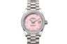 Esta esfera presenta diamantes con engaste chatón en oro de 18 quilates y número romano IX en oro de 18 quilates engastado de 8 diamantes. Rolex ha desarrollado un particular savoir‑faire en la creación de esferas de piedra ornamental, como el ópalo rosa. Los discos de piedra destinados a las esferas se tallan en un bloque de material en bruto. Solo se seleccionan aquellos cuya(s) tonalidad(es) y estructura cumplan plenamente con los estrictos criterios estéticos de la marca. Los elegidos adornarán la esfera de un reloj Rolex confiriéndole una personalidad única.