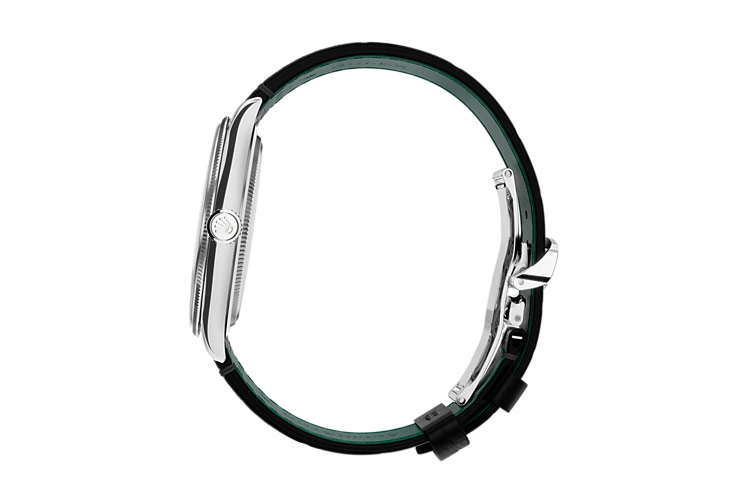 Este reloj elegante y sobrio luce una fina caja coronada por un bisel abombado y, a la vez, sutilmente estriado: su parte inferior está delicadamente estriada y su parte superior, abombada.