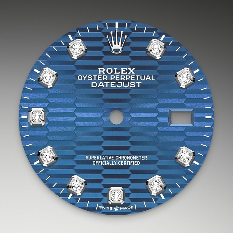 Esta esfera presenta diamantes con engaste chatón de oro de 18 quilates. El motivo «acanalado» es una interpretación gráfica de un elemento emblemático de Rolex: las estrías del bisel, visibles exclusivamente en algunos relojes de la categoría Clásica. A partir de materiales de las eras más remotas y mediante técnicas punteras, la esfera con motivo «acanalado» aporta profundidad y sofisticación al atemporal Datejust.
