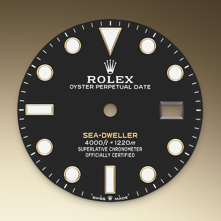 La esfera negra del Sea‑Dweller posee índices y agujas de gran tamaño reservados para los modelos Profesionales. La inscripción «Sea‑Dweller» de color amarillo sobre la esfera negra combina con el oro amarillo. Cuando el Sea‑Dweller se actualizó en 2017, esta misma inscripción aparecía en rojo, como en el modelo original. La innovadora visualización Chromalight de la esfera rompe las barreras de la visibilidad en los ambientes más oscuros. La distintiva luminiscencia azul dura hasta 8 horas, emitiendo un brillo uniforme de una duración casi dos veces mayor que la de los materiales luminiscentes estándar.