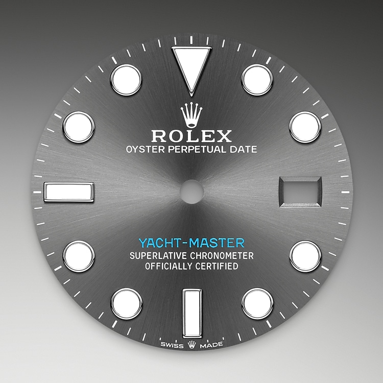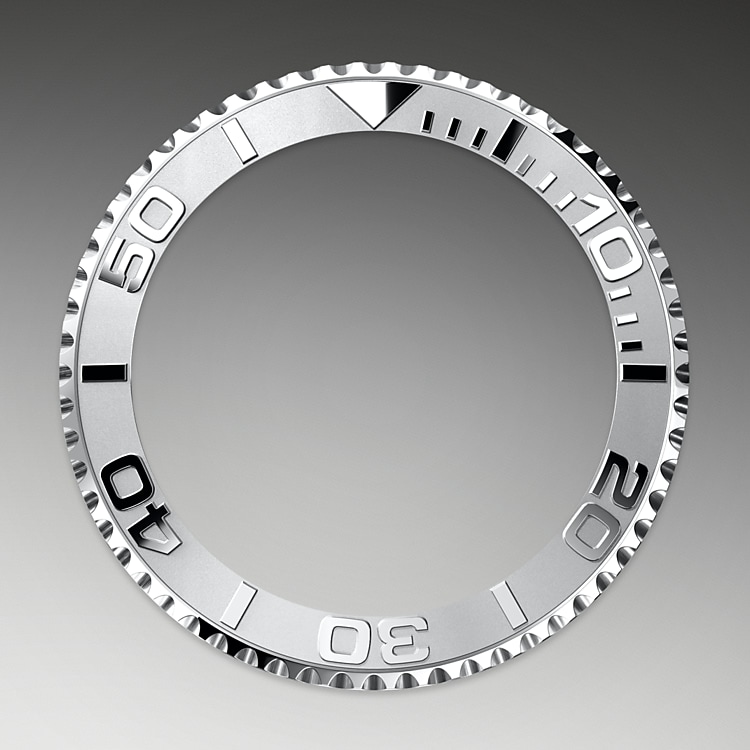 El bisel giratorio bidireccional graduado 60 minutos en relieve del Yacht‑Master está realizado íntegramente en metal precioso o dotado de un disco Cerachrom de cerámica de alta tecnología. Los números y graduaciones pulidos en relieve destacan claramente en el fondo mate pulido con chorro de arena. Este bisel funcional —que permite calcular, por ejemplo, el tiempo de navegación entre dos boyas— es además un componente clave de la distintiva identidad visual de este modelo.