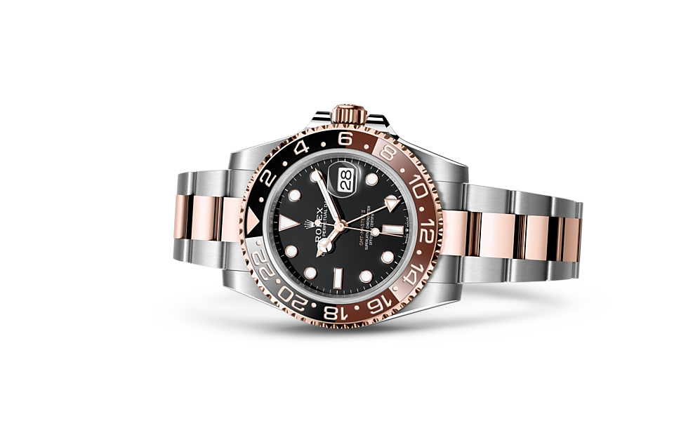 Este modelo presenta una esfera negra y un disco de bisel Cerachrom bicolor en cerámica marrón y negra bicolor. El GMT‑Master II dispone de una aguja adicional que da la vuelta a la esfera en 24 horas y complementa a las tradicionales agujas de las horas, minutos y segundos, así como de un bisel giratorio bidireccional graduado 24 horas. La aguja adicional de 24 horas, con su color distintivo, indica la hora de referencia, la del lugar de residencia, en un primer huso horario que se lee sobre la graduación del bisel. La hora local del viajero puede ajustarse fácilmente mediante saltos de hora en hora gracias a un astuto mecanismo controlado por la corona: la aguja de las horas puede ajustarse hacia delante o hacia atrás, de forma independiente del minutero y el segundero. Esto permite al viajero adaptar su nuevo huso horario sin que afecte a la precisión.