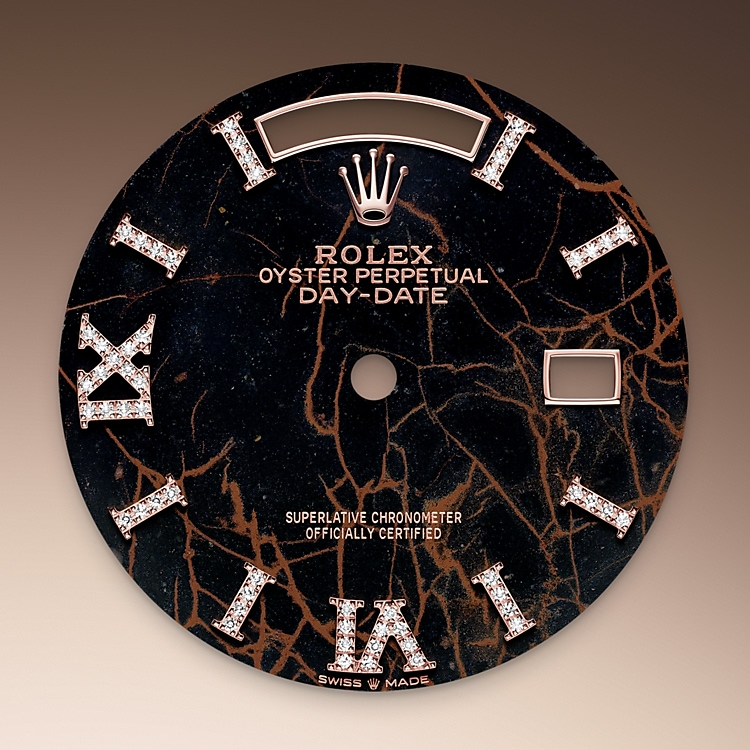 Esta esfera presenta índices en oro de 18 quilates engastados de 32 diamantes y números romanos VI y IX en oro de 18 quilates engastados de 24 diamantes. El Oyster Perpetual Day‑Date 36 integra en su esfera el cuarzo eisenkiesel, una piedra ornamental marrón profundo utilizada por la marca por primera vez en 2021. El eisenkiesel es un cuarzo con sutiles vetas de hierro oxidado. Los discos de piedra destinados a las esferas se tallan en un bloque de material en bruto. Solo se seleccionan aquellos cuya(s) tonalidad(es) y estructura cumplan plenamente con los estrictos criterios estéticos de la marca. Los elegidos adornarán la esfera de un reloj Rolex confiriéndole una personalidad única.